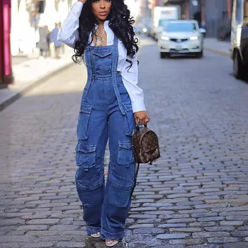 Women's Breathable Fitness Denim Jumpsuit High Waist Multi-Pocket Jean Solid Streetwear Inspired Cargo Print Decoration